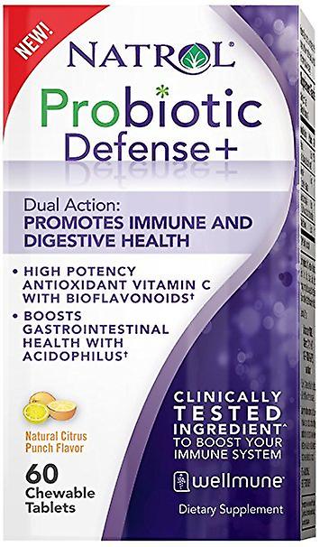 Manage immune and digestive health with the only probiotic with WellmuneNatrol Probiotic Defense+ is a unique dual action product to promote both immune and digestive health. In addition to Acidophilus, a well-known probiotic that helps maintain a balance of "friendly" bacteria in your digestive system, Natrol Probiotic Defense+ contains a blend of ingredients that keep you healthy by boosting your immune health. Wellmune is a natural bakers yeast beta glucan that is clinically proven to help strengthen the immune system by strengthening key immune cells. Studies found that participants taking wellmune additionally experienced enhanced vigor and mental clarity, as well as a reduction in tension and fatigue. Powerful antioxidants Vitamin C and bioflavonoids help block some of the damage caused by free radicals. Research suggests that these compounds work more effectively when taken together.Boosts gastrointestinal health with acidophilusWellmune to help strengthen the immune systemPowerful antioxidant high potency Vitamin C and supporting bioflavonoids help block some of the damage caused by free radicalsNatural Citrus Puch FlavorNo artificial colors, flavors, or preservatives- Brand: Natrol